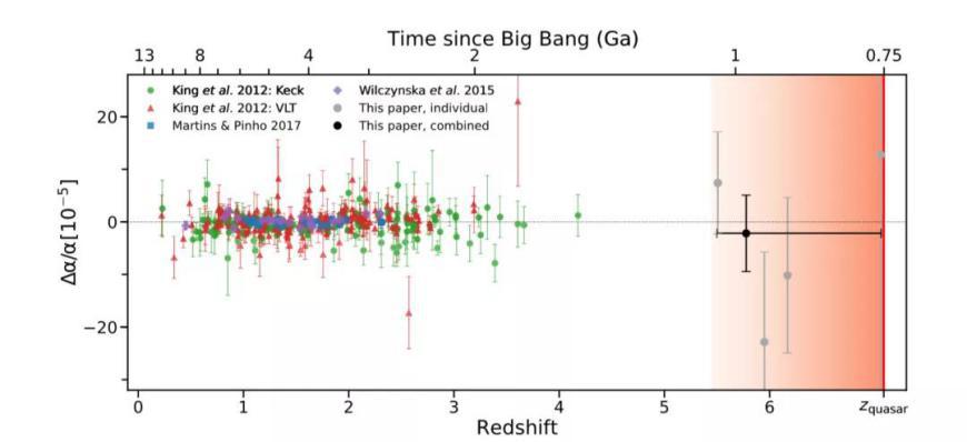 这篇文章中测量的4个数据点和之前文章综合起来构成一个323个测点的数据集,图中可以看出红移量大的测点(也就是距离地球更远的点,或者是更加古老的点)偏离地球上测到的精细结构常数的偏移量也更大,综合所有这些测点进行分析,得到的结论是精细结构常数的测量值存在偶极分布。