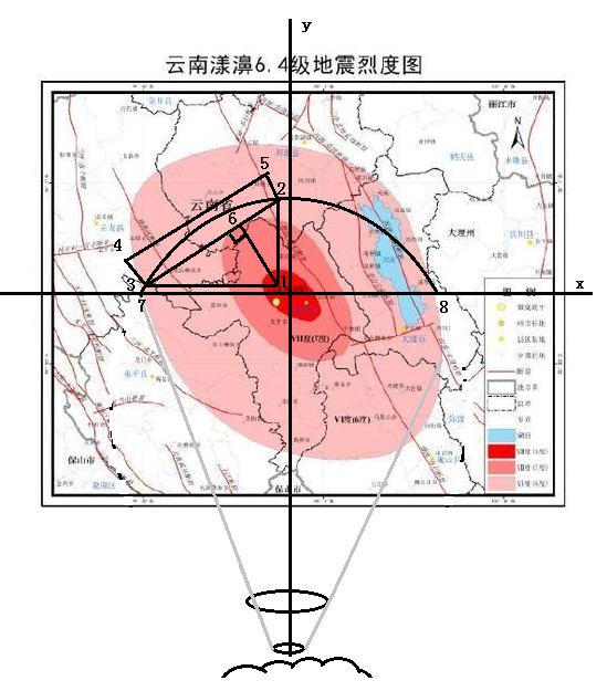 图中1为震中,23连线为植入地下管网,23的直线长度为管网的拉伸前的长度,23圆弧长度为被拉伸长度,45连线为通过植入地表面支撑体相连的地表面一定高度的管网(电缆),78连线为圆弧线,地震冲击波作用地表介质时,地表介质向上以扇形或球面向上抬升到一定高度形成的圆弧线,是地震裂度形成的主要原因,这时,地表表面面积增大。