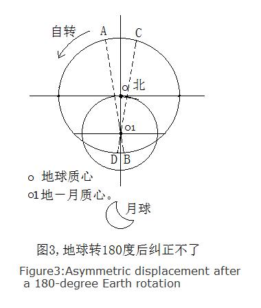 图3,地、月围绕着地-月质心转,地-月质心在离地心约4670千米的位置,在软流层内。地、月围着这个质心转动,对地球来讲这个转动更不对称。对地、月公转所产生的这个不对称远大于地球绕太阳公转所产生的不对称,也就是说这个力远大于前者。