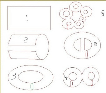 图1是一个平面,大家很容易理解,是二维的平面。图2是把平面卷起来对接成为一个管子,这个时候就不是平面了,是三维的,因为它有长宽高。最根本的特点就是:在一个三维空间,必然存在一个点,可以向两两垂直的方向发出射线。 图3是一个环面,依然是三维的。图4图5是两个环面连在一起,依然是三维,因为没有重叠。就是说它还只有一个点可以发出两两垂直的三条射线。图6依然是一个三维的,因为至少有一个方向无法重叠,例如我们俯瞰。